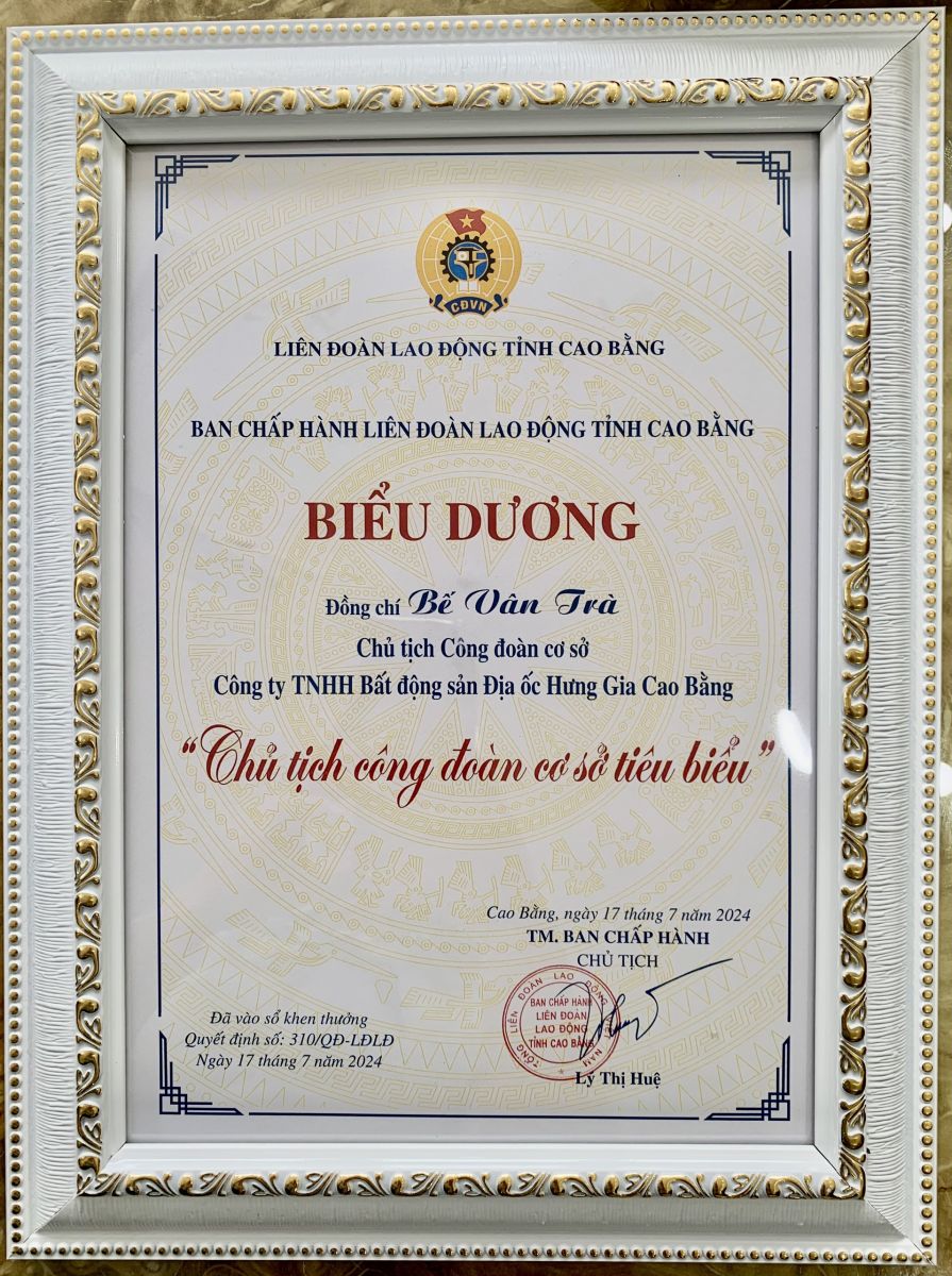 Đồng chí Bế Vân Trà - Chủ tịch Công đoàn cơ sở Công ty TNHH Bất động sản Địa ốc Hưng Gia vinh dự được LĐLĐ tỉnh Cao Bằng biểu dương "Chủ tịch Công đoàn cơ sở tiêu biểu".